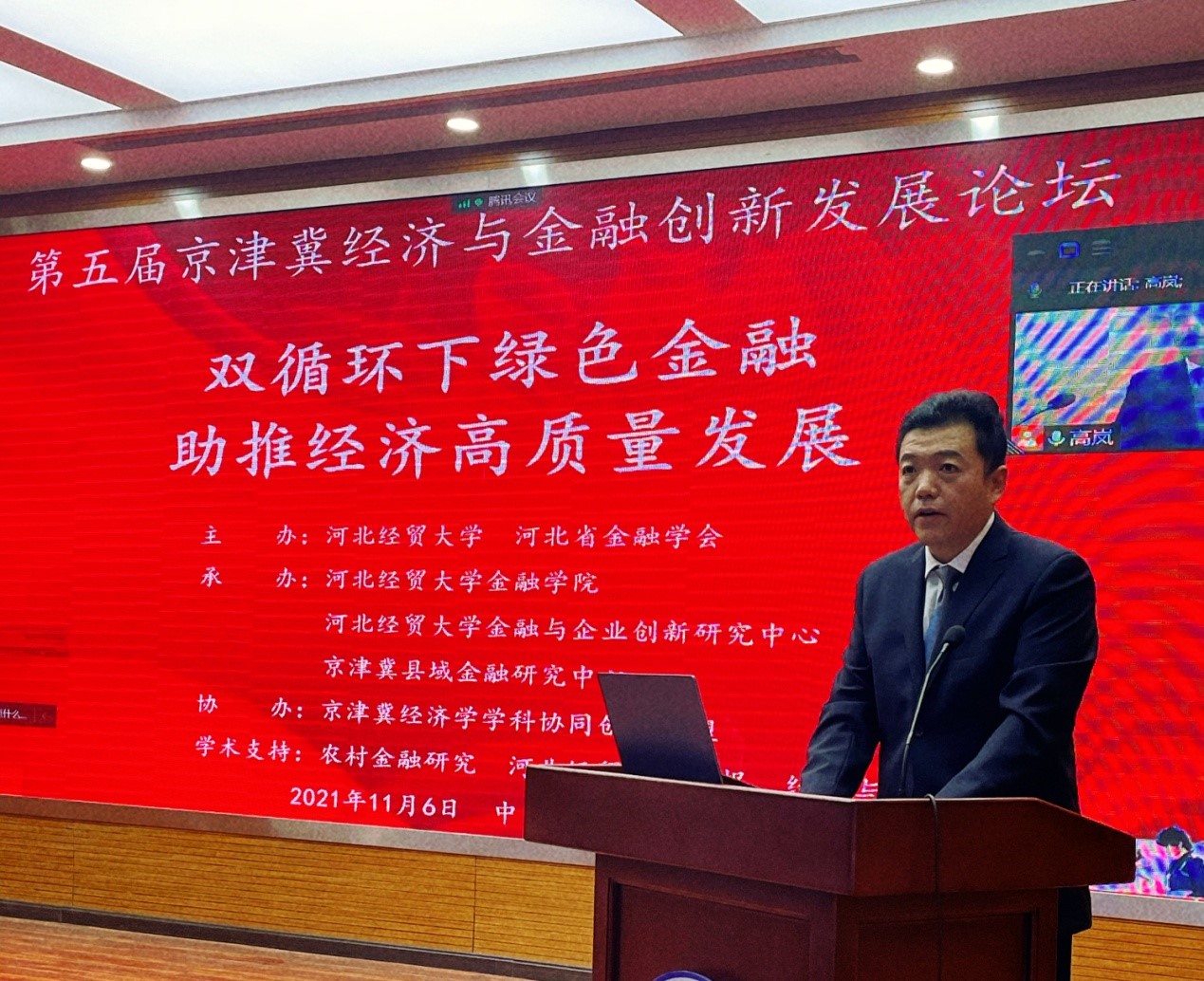 11月6日,由pa集团官方网站、河北省金融学会主办,PA视讯官方网站、pa集团官方网站金融与企业创新研究中心、京津冀县域金融研究中心承办,京津冀经济学学科协同创新联盟协办的第五届“京津冀经济与金融创新发展”论坛在pa集团官方网站举行。本届论坛的主题为“双循环下绿色金融助推经济高质量发展”,来自中国社科院、中央财经大学、天津财经大学、中国石油大学、山西财经大学、中央民族大学、首都经济贸易大学、北京工商大学等高校、科研院所和金融机构的专家学者围绕这一主题展开深入研讨。本届论坛采取线上线下相结合的方式,共计200余人参会。论坛开幕式由PA视讯官方网站经理王重润教授主持。pa集团官方网站党委常委、副董事长和志强、河北省金融学会秘书长郑向阳分别做开幕式致辞。