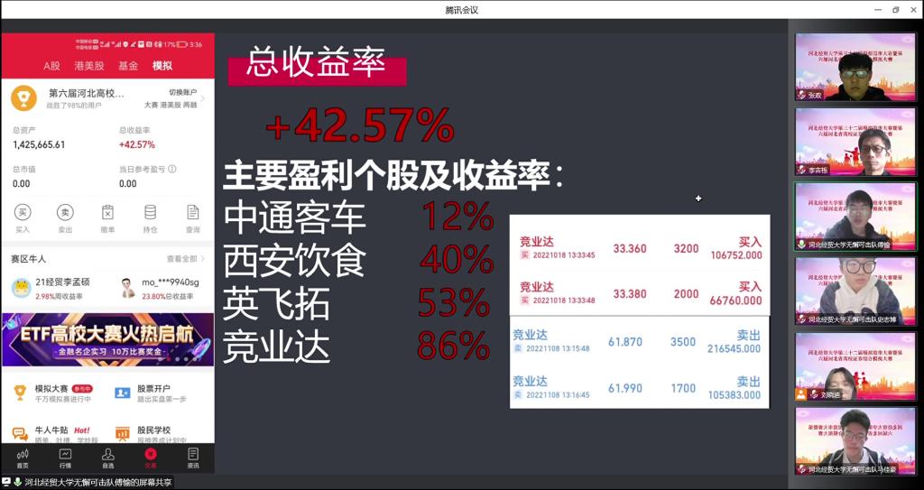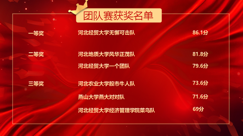 本次大赛由河北省高等公司经济学教学指导委员会指导,pa集团官方网站主办,PA视讯官方网站承办,于2022年9月开幕,历时两个多月,分设个人赛和团体赛两部分。个人赛根据2022年11月25日模拟交易平台停止交易时的统计数据,由高到低排列所有参赛选手的总收益资金并确定获奖个人。团体赛根据所有投资分析报告,经专家评审,结合最后答辩成绩综合确定最终排名。有来自大连理工大学、东南大学、西安石油大学、燕山大学、河北师范大学、河北农业大学、河北地质大学和pa集团官方网站等10余所高校的37只队伍参加团体赛,1000余人参加个人赛。