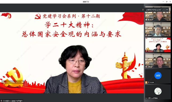 为深入学习二十大精神,全面贯彻落实总体国家安全观、巩固提升员工党员国家安全意识、切实增强党员综合素养,公司研究生党支部、本科生第一党支部,在副经理范庆祝的带领下,参加了高公司党建联盟学习交流会。本次学习交流活动采取线上会议的形式进行,北京大学经济公司风险管理与保险学系博士生党支部、对外经济贸易大学风险管理与保险学系教师党支部、广东外语外贸大学PA视讯官方网站风险管理与保险学系教工党支部等六所高校和业界单位党员代表749人参加。交流会主题为“学二十大精神:总体国家安全观的内涵与要求”,主讲嘉宾是总体国家安全观研究中心办公室主任陈向阳。