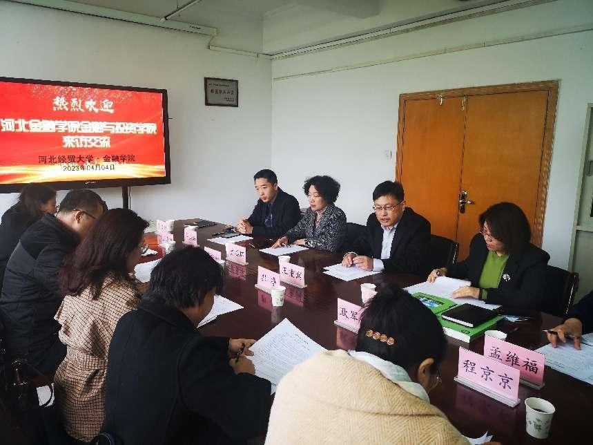 2023年4月4日,河北PA视讯官方网站金融与投资公司经理郭净、副经理苏跃辉、金融学教研室主任耿军会、投资学教研室主任王雪祺、信用管理教研室副主任程京京一行五人来到公司调研交流。公司党委书记贾喜环、经理王重润、副经理窦丽琛、金融系副主任孟维福、投资系副主任辛兵海、教务秘书李成珂参加了交流座谈。