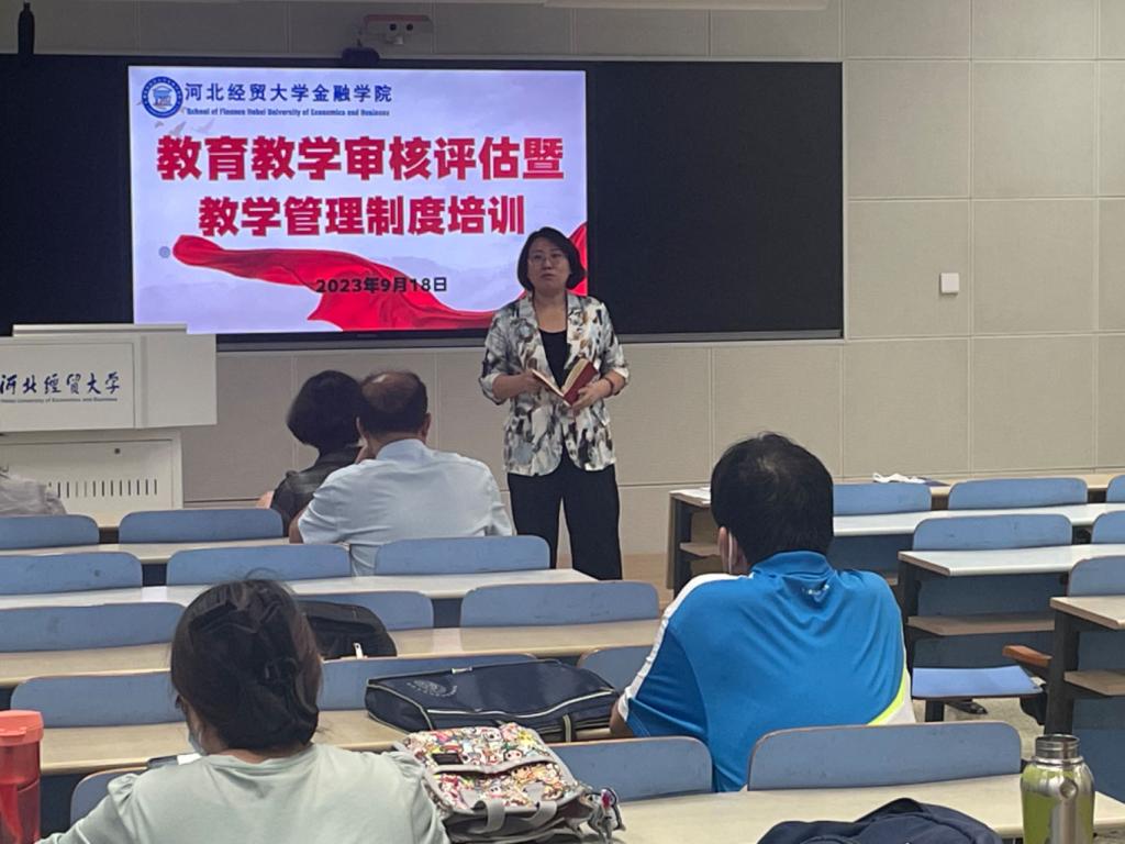 公司副经理窦丽琛做主题培训。她首先强调了本科公司产品审核评估知识学习的重要性,带领大家集体学习了相关知识,尤其是公司新财经人才培养目标、培养特色、培养模式、专业人才培养学分结构等内容,并对课堂教学、课程资源建设等方面提出了要求。然后,她为大家梳理了公司的一系列规章制度,制作了共享学习文档,并带领大家集体学习了《pa集团官方网站本科教学听课管理办法》《pa集团官方网站本科教学调、停课管理规定(2023年修订)》等制度内容。