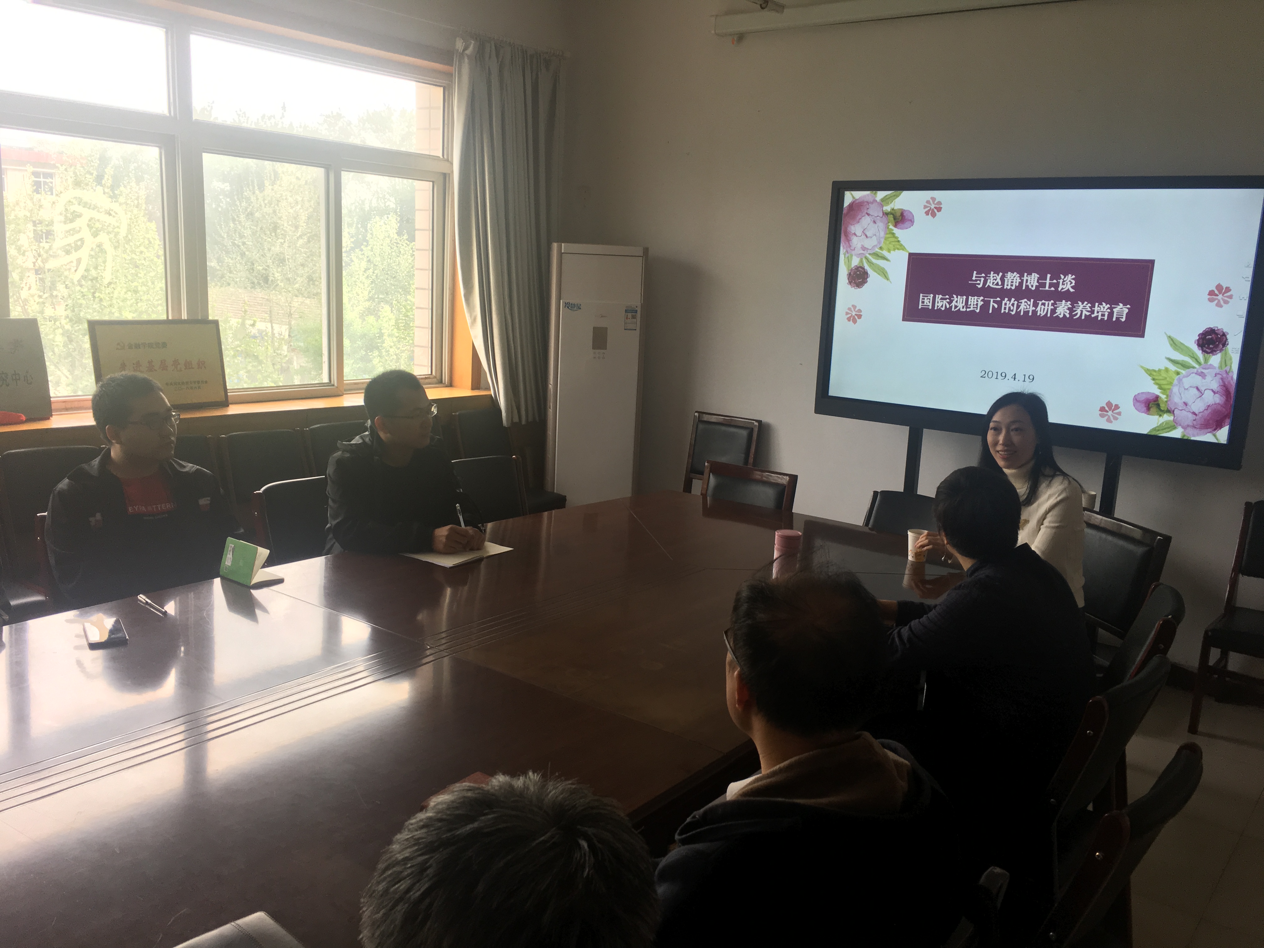 赵静博士在中国内地、美国、中国香港相继完成了自己本科、硕士和博士的求学之路。她结合三地不同的人才培养模式,就如何确定研究方向、如何筛选并精读有价值文献、国际高水平期刊用稿标准及程序以及香港高校教师的教研考核标准等,谈了自己的体会。在场的博士教师就自己感兴趣的科研点和赵静博士进行了积极的互动。