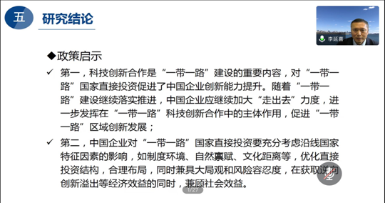 李延喜首先阐述了“一带一路”的现实背景,认为投融资合作面临较大风险,且风险分散机制不健全,国际金融合作存在的诸多问题;其次,从货币合作、投融资合作、金融监管合作、信用合作以及金融服务合作五个方面对“一带一路”沿线国家进行了详细的资金融通分析;最后,李延喜就“一带一路”直接投资对中国企业创新的促进作用提出了相关假设,利用相关数据建立模型并得出结论:“一带一路”直接投资对中国企业创新具有显著的促进作用,东道国特征对企业逆向创新的溢出效应具有重要影响,同时给出了政策启示以及未来的研究设想。