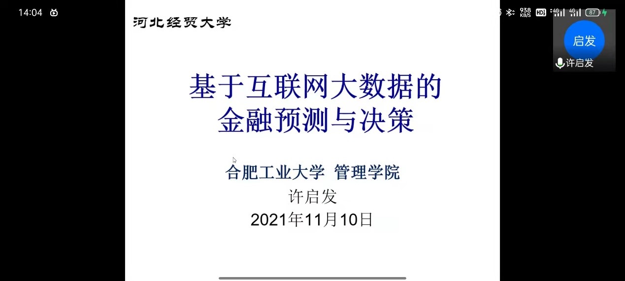 许启发首先概述了互联网大数据来源,介绍了其时代背景,大数据时代包含网络情绪、网络搜索等多种类型的互联网大数据,为金融预测与决策提供了新的信息来源,有助于做出科学决策。然后,介绍了互联网大数据分析的观点争论和应用步骤,包括原始文本库、数据矩阵、信息序列、因变量,由原始文本库提供新数据渠道给因变量。随后,介绍了由监管部门和企业组织共同进行的互联网大数据治理,监管部门包括数据安全、数据风险和隐私保护,企业组织从数据资产管理、模型算法开发、经济社会服务进行介绍。最后建立一个基于网络搜索的股市波动预测的计量模型来进行分析,阐述了互联网大数据收集、处理与挖掘等,解决在股市分析、金融科技等领域出现的预测与决策问题。许老师与师生进行了交流讨论。