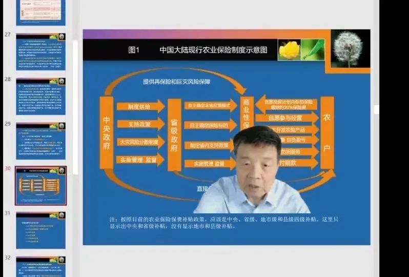 首先,庹老师作题为《中国农业保险的制度、政策和研究》的报告。报告分为五部分:第一,对农业保险的概念、发展政策性农业保险的重要性、农业保险支农惠农机制等内容进行讲解,强调农业保险是农业稳定发展的“压舱石”,在国家发展战略中具有重要意义;第二,系统介绍了我国农业保险发展的四个阶段;第三,从国际和国内两个角度,分析农业保险的制度框架;第四,对我国农业保险的政策体系进行梳理,详细讲解了六类主要政策;第五,结合自身经历,讲述我国农业保险的研究历程,并从宏观和微观两个视角,提出现阶段我国农业保险的研究重点。