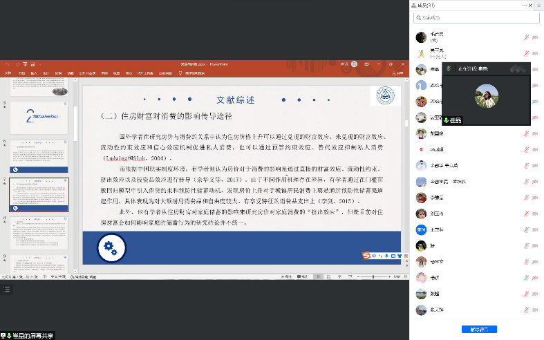 崔晶同学以《住房财富对城镇家庭消费的影响机制分析》为题,选取合适的变量构建多元回归模型探讨了住房财富的财富效应、流动性约束以及自我保险效应等内容;杨妍同学以《住房流动性对家庭资产配置影响研究》为题,结合住房调控政策,构建核心解释变量衡量住房流动性,从限购政策、家庭风险偏好水平、家庭预期收益三个维度剖析了住房流动性对家庭资产配置的影响及其机制。来自公司的柴国俊、李妍、赵璐曼、高旺、孟维福等老师,对两位同学的研究作了精彩点评和悉心指导。老师们对崔晶同学的研究提出了进一步厘清消费理论、添加控制变量解决内生性问题,以及实证结果与现实相悖需要给出合理解释等建设性意见;对杨妍同学的研究,提出了添加核心解释变量计算的支撑文献、采用DID方法研究住房调控的政策效果,以及运用非线性模型更为恰当解释住房流动性对家庭住房资产配置的影响等意见建议。