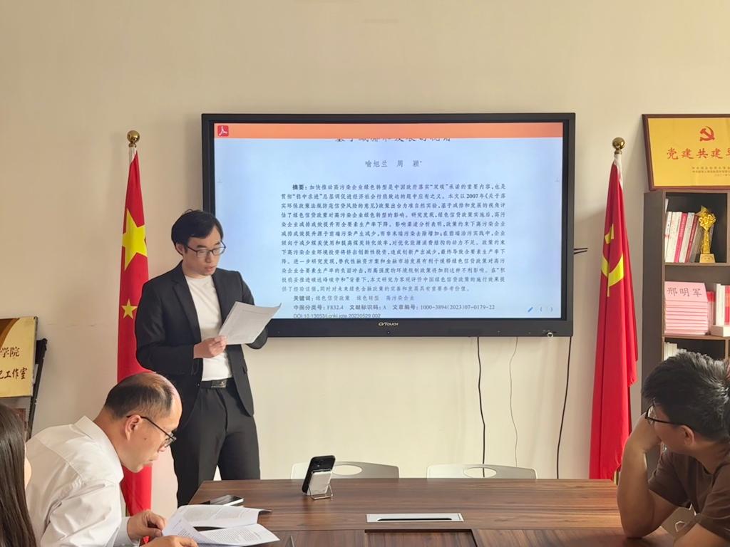 杜朋毅同学以2007年相关政策出台为准自然实验,分析发现绿色信贷政策显著提升了高污染企业的减排成效,但也导致其全要素生产率下降,且企业更倾向减少煤炭使用而非优化能源结构,环境投资也挤占了创新性投资。范庆祝副经理点评该论文时指出,研究紧扣时代脉搏,方法严谨,结论有深度,对绿色金融政策评估有重要参考价值,同时建议同学们在论文写作过程中要仔细严谨,不断提升自身的科研能力。